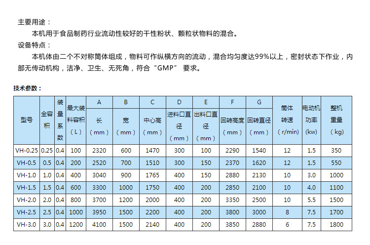 產(chǎn)品概述: 本機(jī)適用于制藥、化工、食品的干粉狀、顆粒裝物料的混合。該機(jī)混料筒結(jié)構(gòu)獨(dú)特,混合均勻,效率高,不積料。整機(jī)結(jié)構(gòu)簡(jiǎn)單,操作容易。外表面和物料接觸部分均采用優(yōu)質(zhì)不銹鋼制造,造型美觀(guān),維護(hù)、清洗方便。 應(yīng)用場(chǎng)景: 本機(jī)用于制藥及其它行業(yè)的粉狀或粒狀物料混合之用。本系列混合機(jī)有高效混合型和普通混合型兩種,高效型混合機(jī)主要對(duì)較細(xì)的粉;?qū)δ骋恢髁虾枯^少的物料均能混合均勻;普通型混合機(jī)主要適用于一般物料或產(chǎn)量較大的企業(yè)使用。筒體光滑無(wú)死角、整機(jī)采用不銹鋼材料制作、且外型美觀(guān)等特點(diǎn)。 工作原理: 本機(jī)一端裝有電機(jī)與減速機(jī),電機(jī)功率通過(guò)皮帶傳給減速機(jī),減速機(jī)再通過(guò)聯(lián)國(guó)器傳給V型桶。使V型桶連續(xù)運(yùn)轉(zhuǎn),帶動(dòng)桶內(nèi)物料在桶內(nèi)上、下、左、右進(jìn)行混合。 材質(zhì)及結(jié)構(gòu): 1、 混合機(jī)的筒體采用2.5mm304-2B不銹鋼材料制作,外包采用1.2mm304-2B的不銹鋼材料制作,支架采用5#槽鋼。 2、混合的出料閥選用全不銹鋼精加工而成,并在連接處采用定型硅橡膠材料密封,確保機(jī)器在工作時(shí)的密封效果。 3、混合機(jī)的進(jìn)料口采用選進(jìn)的快開(kāi)結(jié)構(gòu),使用戶(hù)在進(jìn)料和清洗時(shí)操作簡(jiǎn)便。 4、混合機(jī)筒體兩側(cè)拼縫處加焊兩塊不銹鋼引板并采用拋光處理,使筒體內(nèi)無(wú)一處死角,確保混合機(jī)在混合、清洗時(shí)能夠達(dá)到理想的效果。 5、混合機(jī)內(nèi)設(shè)有強(qiáng)制攪拌裝置。